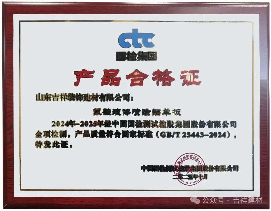 在大會備受矚目的“創(chuàng)新產(chǎn)品合格證頒發(fā)儀式”上,山東吉祥裝飾建材迎來了榮耀時刻。公司生產(chǎn)的氟碳液體噴涂鋁單板與鋁塑復合板兩款核心產(chǎn)品,經(jīng)過嚴格的評審與檢驗,雙雙被授予產(chǎn)品合格證。這份由國家權威機構頒發(fā)的認證,是對吉祥產(chǎn)品質(zhì)量、技術工藝及性能指標的至高肯定。