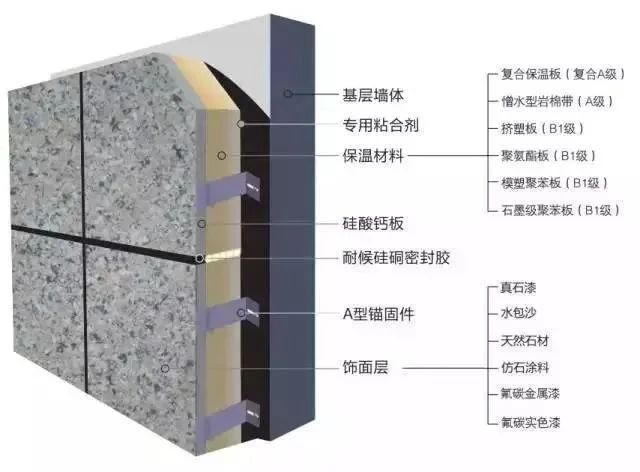 保溫層分為:巖棉板、真金板(TPA)、無機(jī)改性不燃板(IPS)、石墨聚苯板(SEPS)、熱固聚苯板(金剛板)、模塑聚苯板(EPS)、擠塑聚苯板(XPS)、發(fā)泡陶瓷板等。
