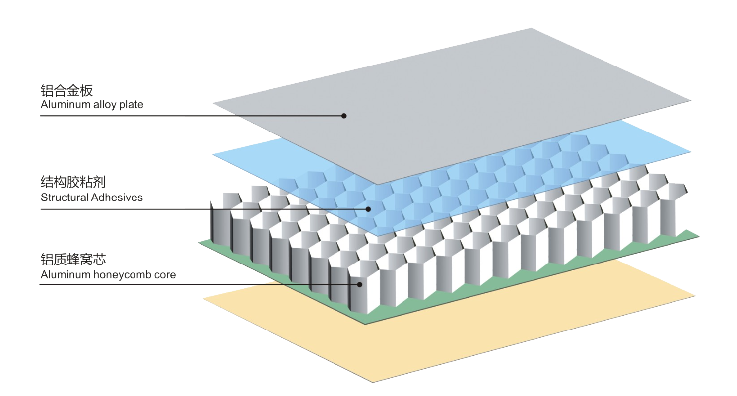 鋁蜂窩板采用氟碳涂層的鋁合金板作為面、背板,以耐腐蝕鋁蜂窩芯作為夾心,雙組份高溫固化聚氨醋為膠粘劑,在專用復(fù)合生產(chǎn)線上經(jīng)加溫、加壓復(fù)合固化而成。鋁蜂窩板為全鋁夾心復(fù)合結(jié)構(gòu),具有比重小,比強(qiáng)度、比剛度高等特點(diǎn),兼具隔音、隔熱功能。