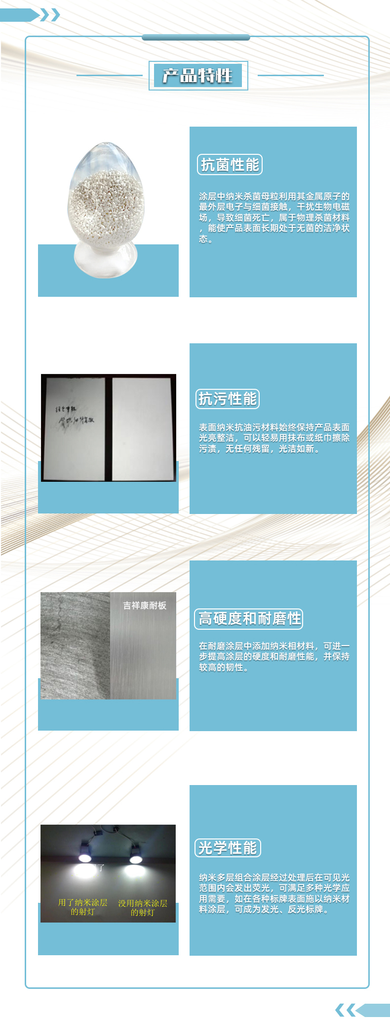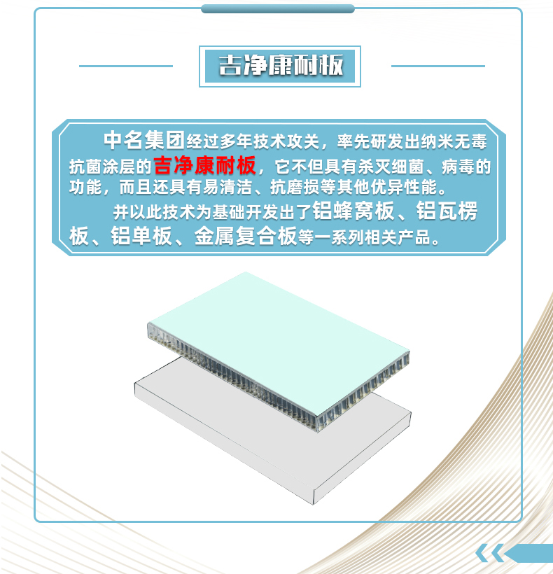 中名集團(tuán)經(jīng)過多年技術(shù)攻關(guān),率先研發(fā)出納米無毒抗菌涂層的吉凈康耐板,它不但具有殺滅細(xì)菌、病毒的功能,而且還具有易清潔、抗磨損等其他優(yōu)異性能。并以此技術(shù)為基礎(chǔ)開發(fā)出了鋁蜂窩板、鋁瓦楞板、鋁單板、金屬復(fù)合板等一系列相關(guān)產(chǎn)品。