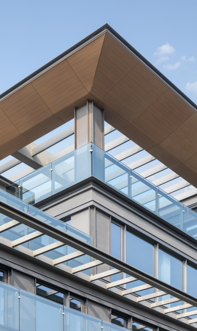 重慶龍湖金茂·北島大量采用仿木紋鋁板和通高玻璃幕墻構(gòu)筑的歸家空間立面,仿木紋色彩與自然更為親近,通高的玻璃幕墻則讓建筑更具現(xiàn)代感。