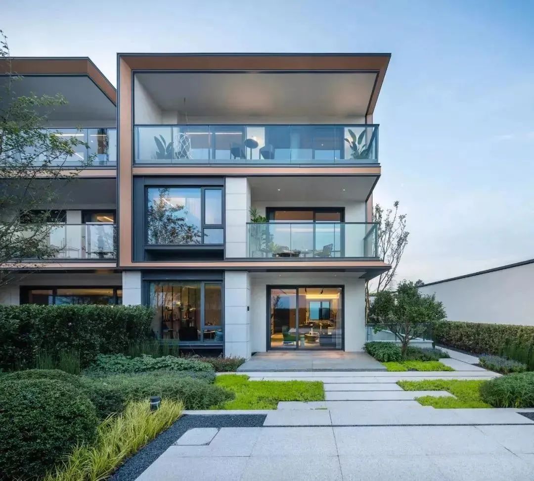 杭州綠城湖境云廬,屋檐外挑、陽臺(tái)分戶欄柵、吊頂?shù)炔课欢际褂昧?span style="margin: 0px; padding: 0px; outline: 0px; max-width: 100%; box-sizing: border-box !important; overflow-wrap: break-word !important; color: #B89970;">仿木紋鋁板,通過各種細(xì)節(jié)凸顯中式風(fēng)格。