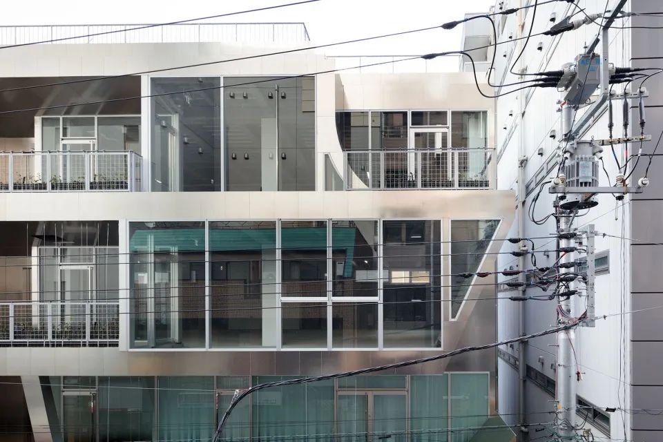 日本SHIKISM商業(yè)綜合體建筑以彩色鏡面鋁板立面融入商業(yè)街,其正面三層陽臺的大小和形狀各不相同,賦予立面變化的效果。陽臺表面采用與立面相同顏色的鋁板,映出建筑內(nèi)外人的活動。