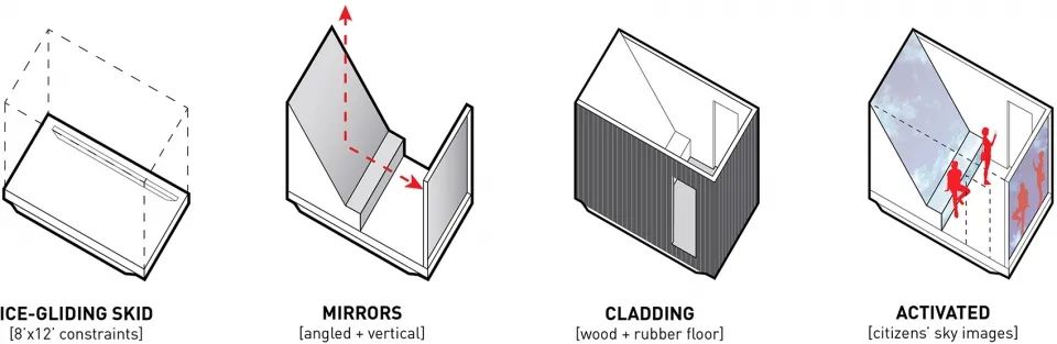 加拿大Skybox裝置使用45度角的鏡面鋁板將天空景象反射到展亭內(nèi),這塊拋光鋁板折疊成與整個展亭寬度相同的長椅。一塊垂直的鏡面鋁板與反射天空的鋁板相對,映射出游客坐在云層之中的影像。