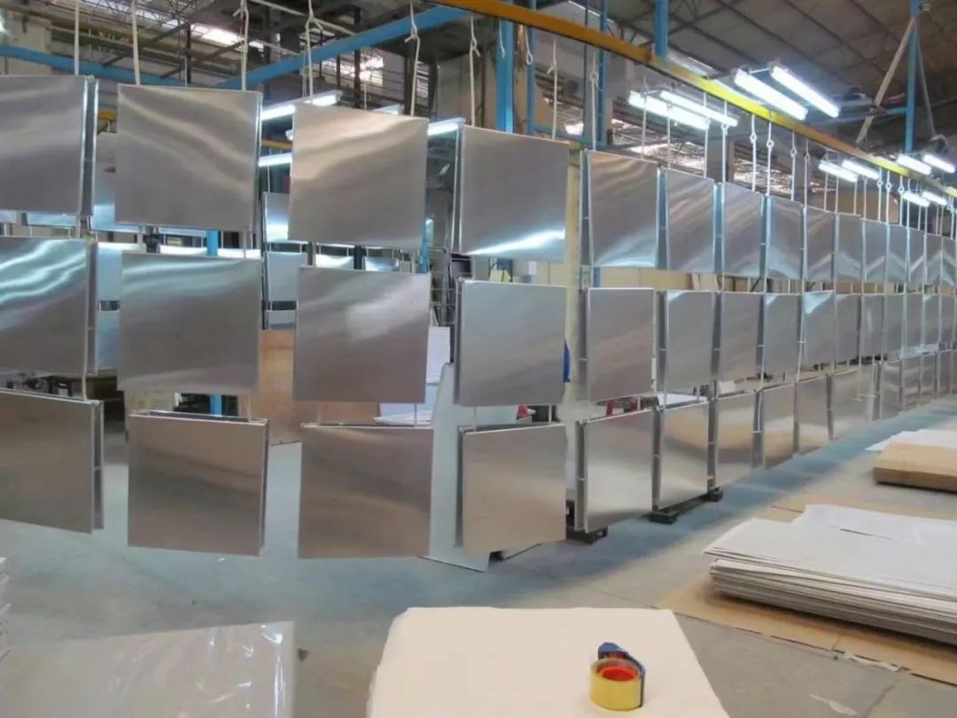 單板一般是2~4mm的鋁合金板,在制作成墻板時,先按二次設(shè)計的要求進行鈑金加工,直接折邊,四角經(jīng)高壓焊接成密合的槽狀,墻板背面用電焊植釘?shù)姆绞筋A(yù)留加強筋的固定螺栓。鈑金工作完成之后,再進行噴涂。