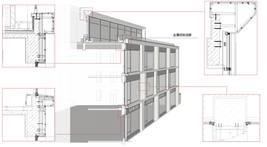 通過滾涂印刷和多次打樣,金麟府選用了效果俱佳、可以假亂真的仿石鋁單板,石材質(zhì)感增添了建筑的細(xì)節(jié)表達(dá)和價(jià)值感,同時(shí)也保證了建筑的整體性。