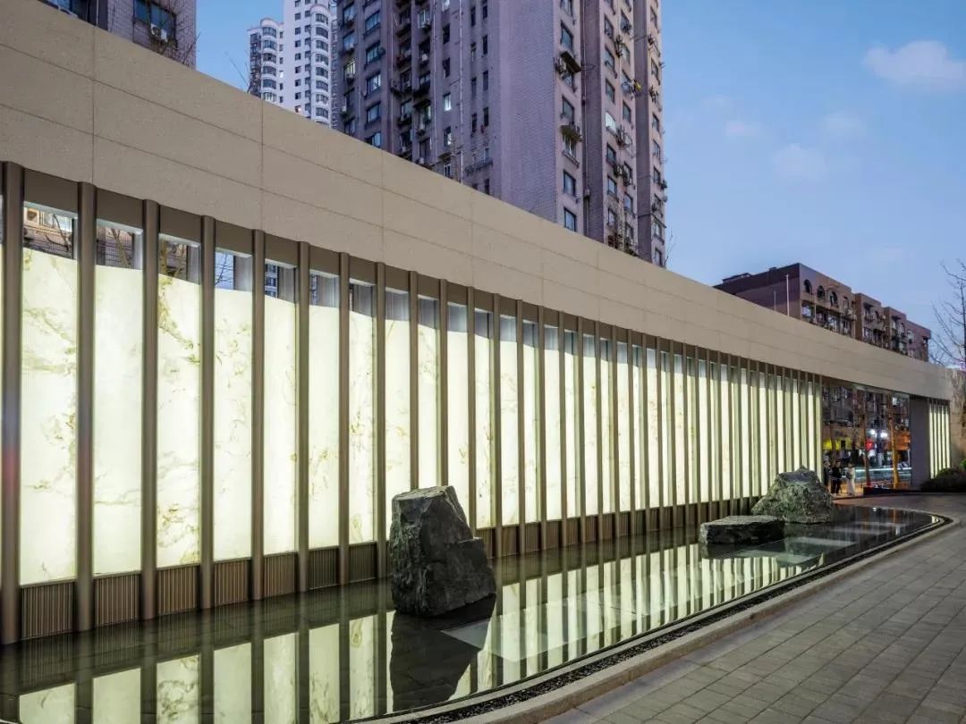 在“萬科 中輿路一號oriental one”示范區(qū)中,運(yùn)用了另一種超薄石材——透光超薄石材,石材的拼貼營造出精致的景觀效果。