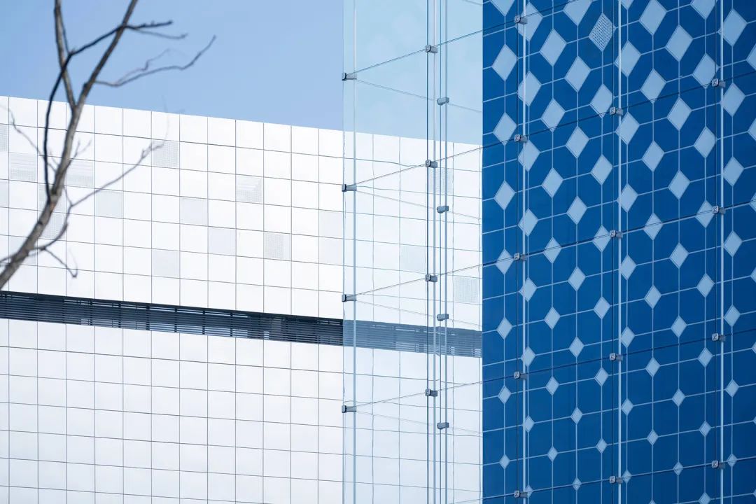 后側(cè)動(dòng)力樓與運(yùn)維樓采用雙層幕墻,外層覆面為正方形網(wǎng)格的鋁板幕墻。像素化的鋁板單元通過(guò)洞口的虛實(shí)變化,代表計(jì)算機(jī)語(yǔ)言中的“0”與“1”的二元邏輯,巨大的銀白色轉(zhuǎn)角體量形成“字節(jié)跳動(dòng)”的空間邊界。