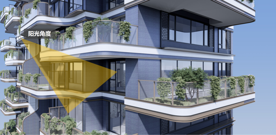 空中花園兼顧上下花園的采光和私密是第四代建筑面臨的一大問題,南側(cè)不宜設置連續(xù)過長的南向空中花園,采用連續(xù)長跑道式空中花園,會對下層采光造成影響巨大,錯落式露臺排布可擴大奇偶層采光面積,科學性的交叉光線設計,讓陽光通過角度射進生活空間,讓采光度與視線寬度都得到增強。