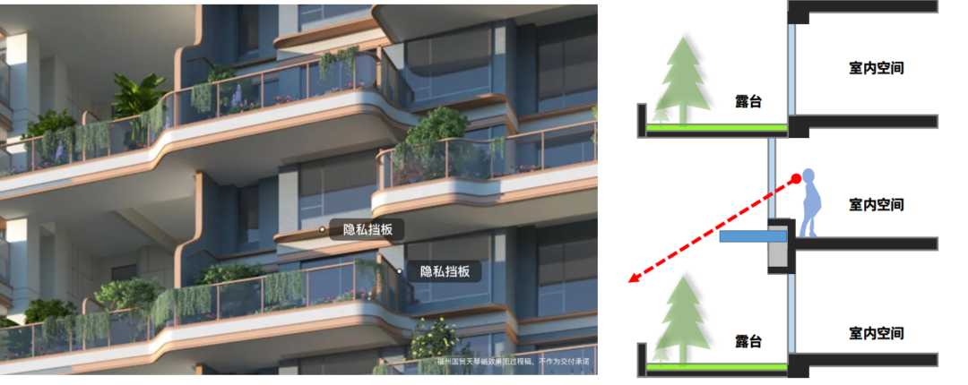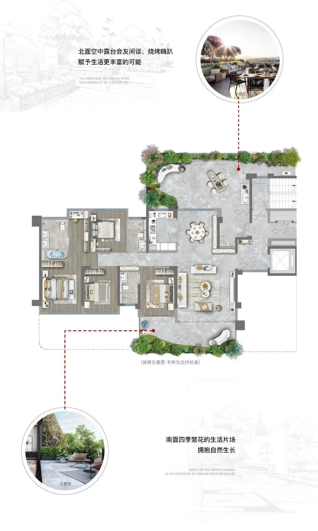露臺私密性上優(yōu)化升級,露臺側(cè)方設計隱私擋板,南北向、奇偶錯層挑高布置共享式超尺度露臺,對戶內(nèi)完全無遮擋,兼顧私密性與采光的同時令居住的功能和場景更為多元化,最大化實現(xiàn)生態(tài)住宅的花園生活。