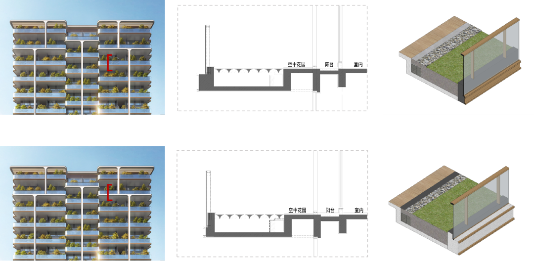 3、戶屬空中花園的層高不低于兩個自然層高,不封閉、無圍護結(jié)構(gòu),綠化覆土深度不低于0.5米,綠化面積不低于60%,出挑尺寸大于2.4米且不超過3.6米;公共休閑綠化平臺的層高不低于兩個自然層高,不封閉、無圍護結(jié)構(gòu),綠化覆土深度不低于0.5米,綠化面積不低于30%,應連接一定數(shù)量住戶并供業(yè)主共享。