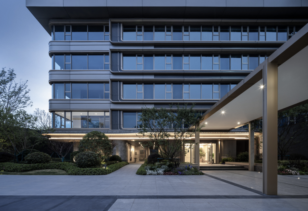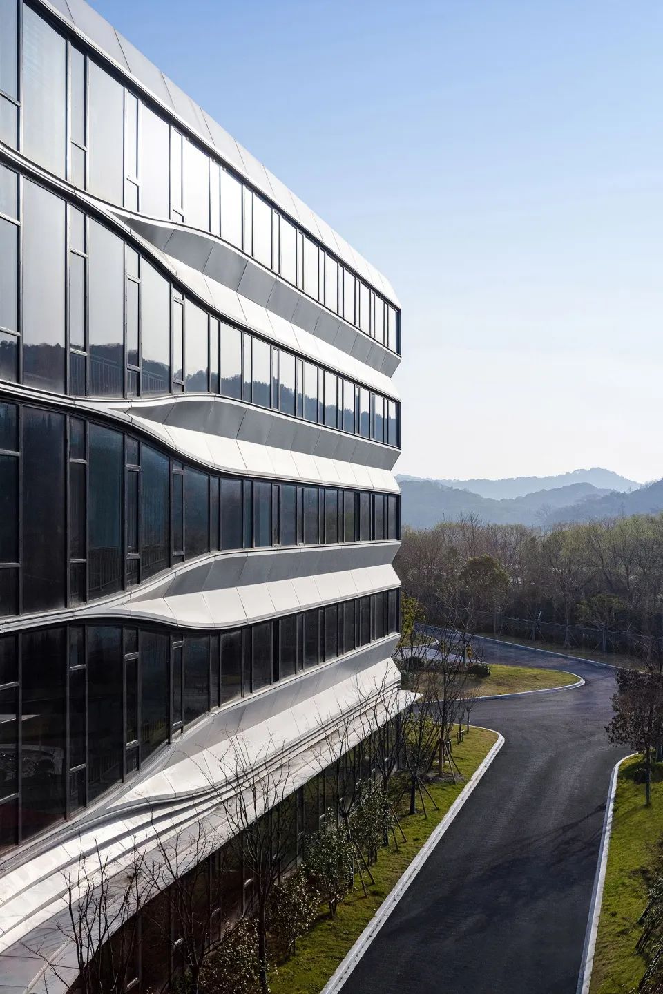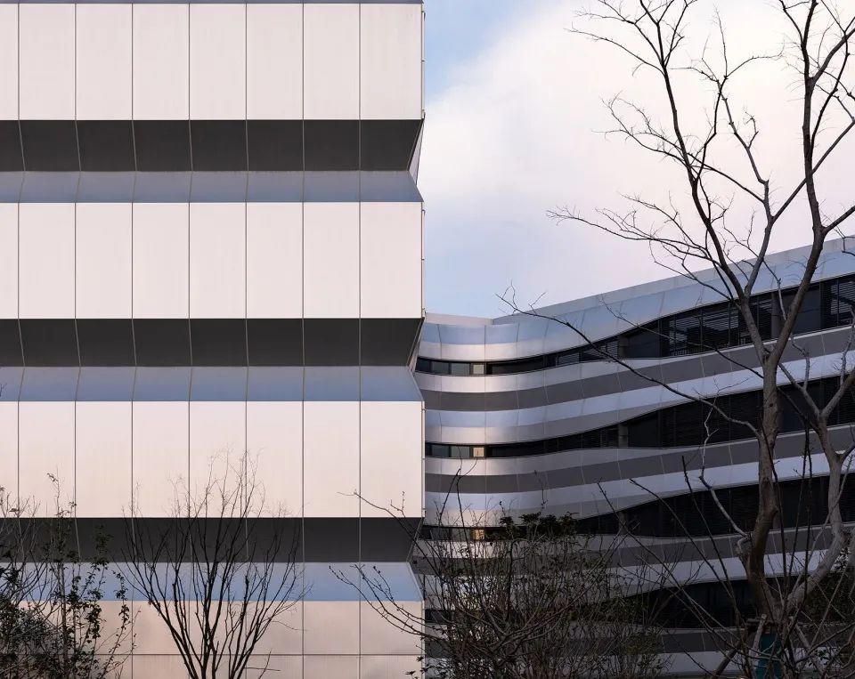 杭州HIS國際學(xué)校主教學(xué)樓的建筑立面通過對(duì)水平線的強(qiáng)調(diào),采用銀白色鋁板和水晶灰玻璃,通過水平方向上的內(nèi)凹折面,形成了極富未來感的現(xiàn)代建筑形象。