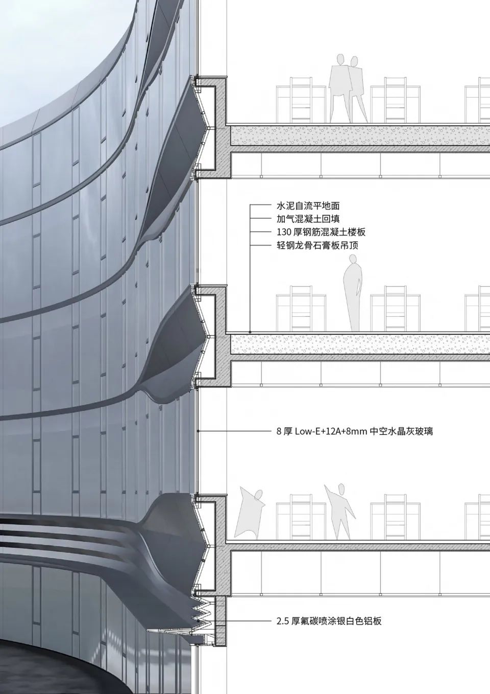 1、鋁板的常見種類: 穿孔鋁板、蜂窩鋁板、陽極氧化鋁板、石材轉(zhuǎn)印鋁板、木紋轉(zhuǎn)印鋁板、水波紋鋁板、雙曲鋁板、仿銅鋁板、拉絲鋁板、鋁單板 ... 2、材料特性: 優(yōu)點(diǎn): ① 綠色環(huán)保,可百分百回收再利用; ② 防火防水,鋁材本身就不會(huì)生銹,所以自然避免了這一現(xiàn)象; ③ 剛性好,重量輕,強(qiáng)度高; ④ 防蟲駐易清理,因?yàn)槿X鋁板的鋁材不會(huì)產(chǎn)生蟲蛀的現(xiàn)象,而且表面是高工藝壓縮,所以耐擦拭易清洗。 ⑤ 不易玷污,便于清潔保養(yǎng); ⑥ 安裝施工方便快捷,在工廠成型,施工現(xiàn)場(chǎng)不需裁切,只需簡(jiǎn)單固定; 缺點(diǎn): ① 鋁板幕墻系統(tǒng)的抗變形能力須對(duì)幕墻系統(tǒng)的每個(gè)重要部位進(jìn)行科學(xué)的力學(xué)計(jì)算,考慮風(fēng)壓、自重、地震、溫度等作用對(duì)幕墻系統(tǒng)的影響,對(duì)埋件、連接系統(tǒng)、龍骨系統(tǒng)、面板及緊固件進(jìn)行仔細(xì)校核,確保幕墻的安全性; ② 鋁板價(jià)格相對(duì)昂貴; 3、應(yīng)用案例(因篇幅原因,簡(jiǎn)單舉例2-3個(gè)項(xiàng)目) 能建城發(fā)·中寧府的外立面采用大面積玻璃+金屬鋁板,在色彩搭配上,以香檳金和典雅灰的奢雅色彩美學(xué)為基礎(chǔ),局部多色澤處理增加立面趣味,其在陽光不同方位的照射下,輝映出不同的光澤。 外立面實(shí)景圖 在主線條轉(zhuǎn)折和形體轉(zhuǎn)角區(qū)以圓弧加工手法,更運(yùn)用了轉(zhuǎn)角、切割、圓弧等復(fù)雜的程序,呈現(xiàn)建筑的柔和立面特質(zhì)。 主教學(xué)樓墻身外觀 ? 蘇圣亮 主教學(xué)樓墻身大樣 ? line+ 建筑外觀? 蘇圣亮 入口細(xì)部 ? xf photograph 入口細(xì)部 ? xf photograph 實(shí)景圖 ?耿廣瀚 塔樓整體造型簡(jiǎn)潔而優(yōu)雅,主體采用6mm50+15A+6mm淺灰色雙層low-e中空玻璃玻璃幕墻加外掛銀白色鋁板水平橫線條的處理方式,簡(jiǎn)潔大氣;同時(shí),通過不同樓層間水平線條90度的細(xì)微扭轉(zhuǎn),形成充滿動(dòng)感的肌理,在陽光下也產(chǎn)生出微妙的光影變化。 實(shí)景圖 ?耿廣瀚 實(shí)景圖 ?耿廣瀚 為了實(shí)現(xiàn)水平橫線條的旋轉(zhuǎn)造型,將曲線的曲率由1200mm調(diào)整為2000mm,簡(jiǎn)化了制作和施工工藝,達(dá)到了簡(jiǎn)潔、高效、經(jīng)濟(jì)的實(shí)現(xiàn)了預(yù)期的設(shè)計(jì)效果。 陽極氧化鋁板立面, ?文沛