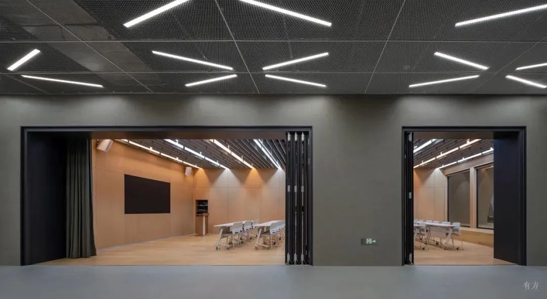 木飾面吊頂作為氛圍營造的手段,并不遮擋建筑本身的結(jié)構(gòu)骨架,而是作為建筑結(jié)構(gòu)間面的填充存在,而歸整機電設(shè)備的金屬網(wǎng)板,也以其材質(zhì)的特性,一方面將機電設(shè)備
