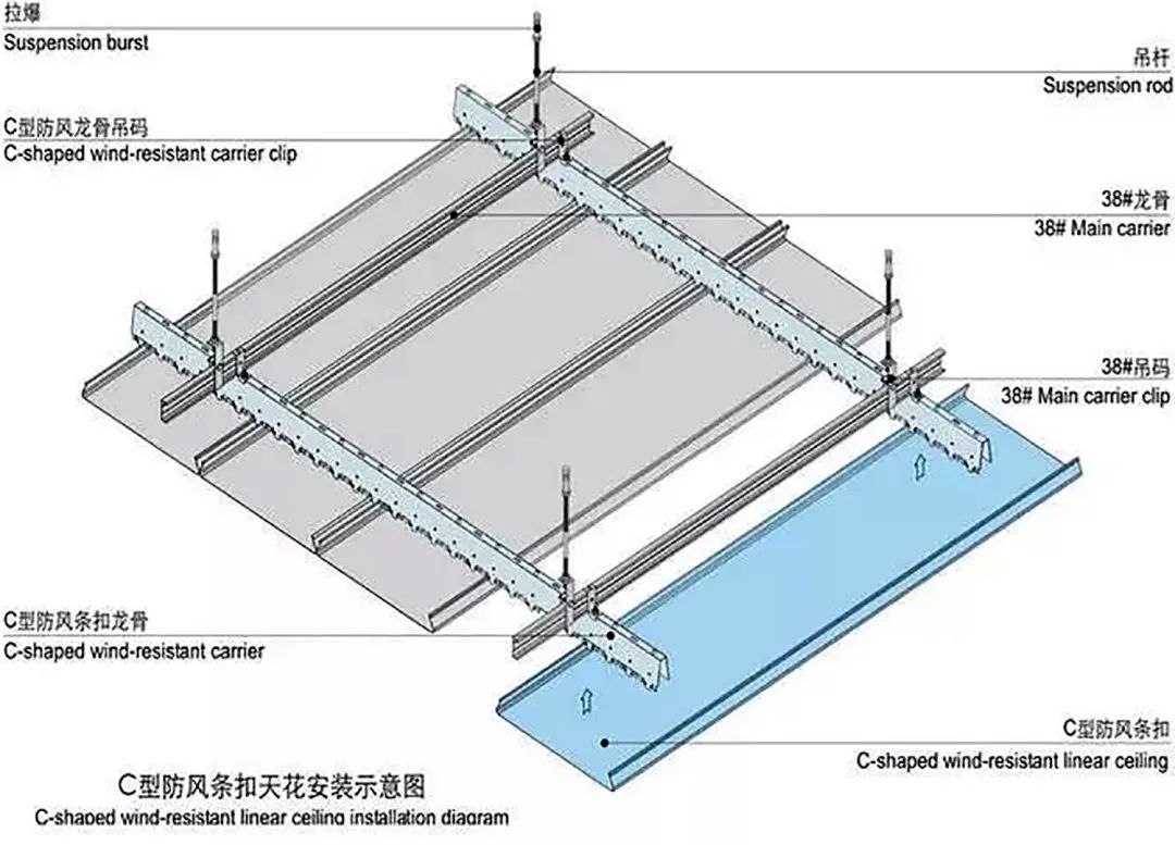金屬條板常用規(guī)格有:84寬C型、84寬R型、30/80/130/180寬B型、75C/150C/225寬C型、300寬C型、300寬弧形等,可做成密閉式吊頂,也可做成半開敞式吊頂,
