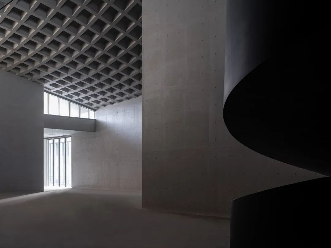 琴臺美術(shù)館柱室內(nèi)屋頂采用了與井格對應(yīng)的、順應(yīng)了曲面的參數(shù)化金屬延展網(wǎng)吊頂。透過半透明的吊頂還是能看到屋頂?shù)慕Y(jié)構(gòu),也遮蔽著其中的機電管線。