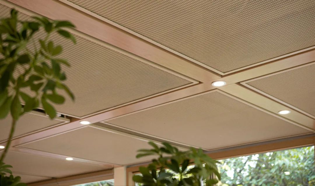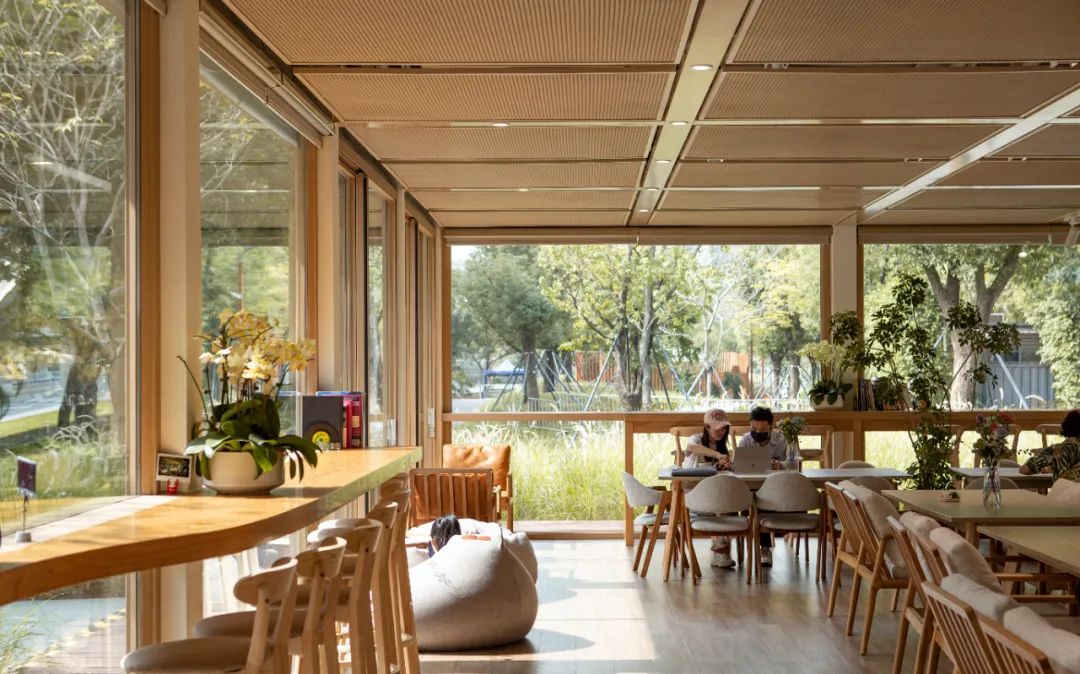 深圳大沙河公園濱水茶室在吊頂?shù)奶幚砩?,為了更好地營造出茶空間的氛圍,設(shè)計運用了木橫梁搭配金屬網(wǎng)簾的交織排布,巧妙隱藏機電管道的同時,也讓通透的空間多