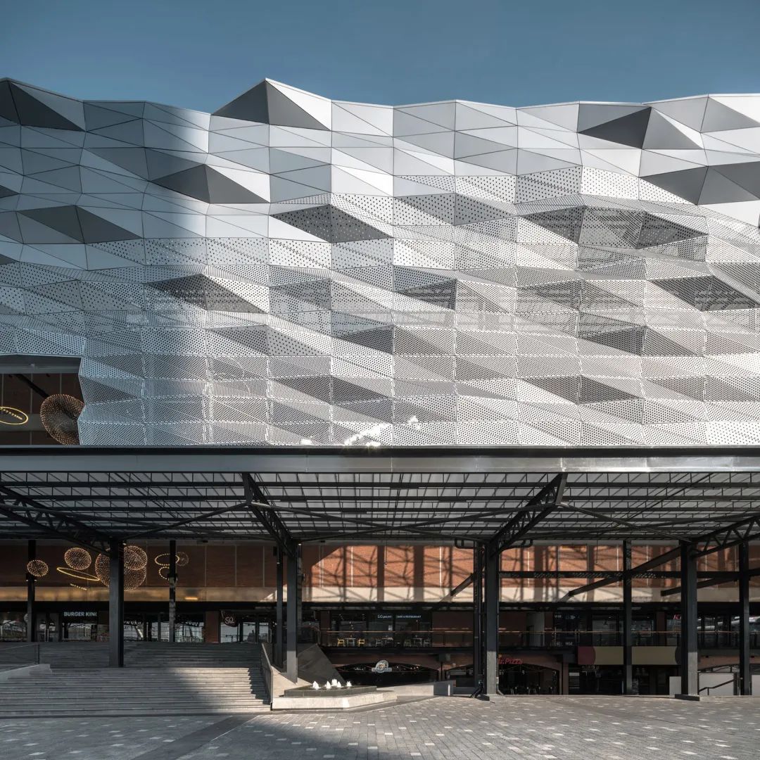 建筑通過新型沖孔鋁單板的使用,讓建筑呈現(xiàn)出輕盈、朦朧夢幻之美,創(chuàng)造了豐富而細膩的空間體驗。