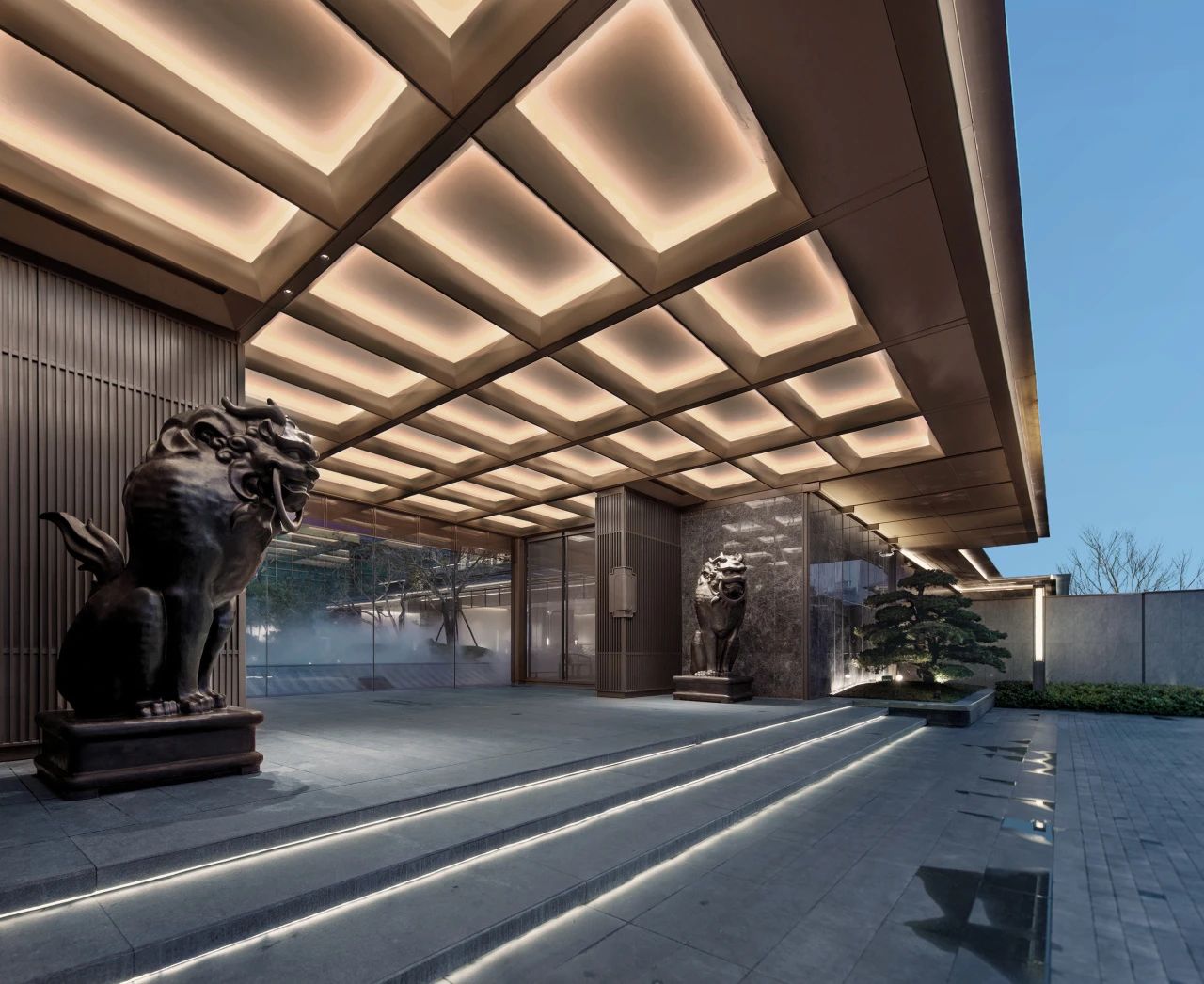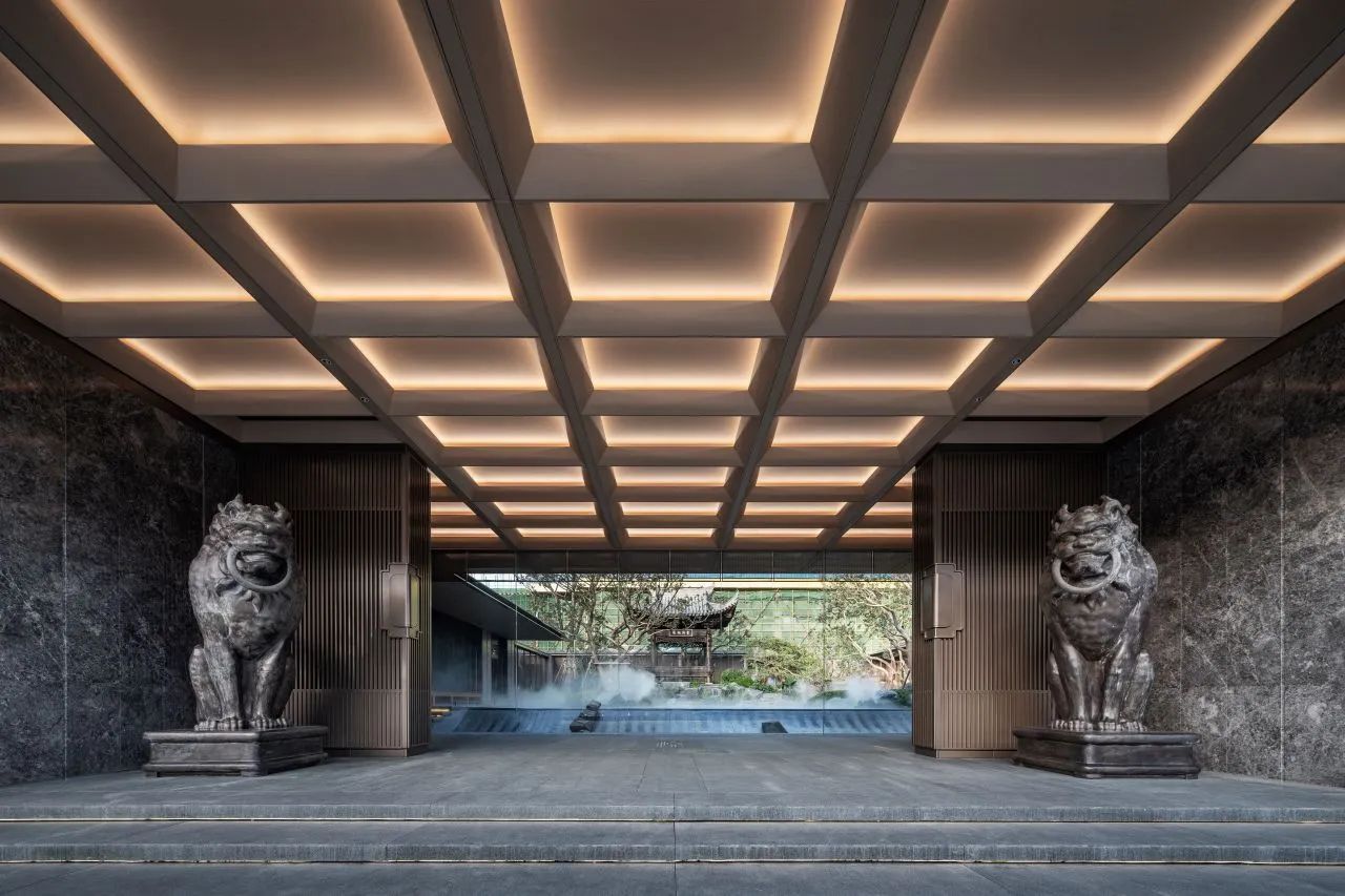 門堂中心區(qū)域的吊頂來自宋代大格平棊天花,經(jīng)現(xiàn)代演繹后,線條利落的大方格結(jié)合暗敷的燈帶,其余位置采用折槽木紋鋁板及型材收邊的吊頂形式,充分發(fā)揮現(xiàn)代材料及工藝之美。