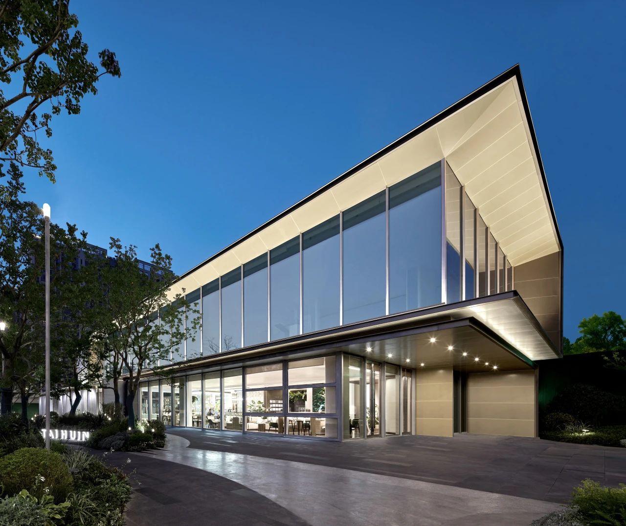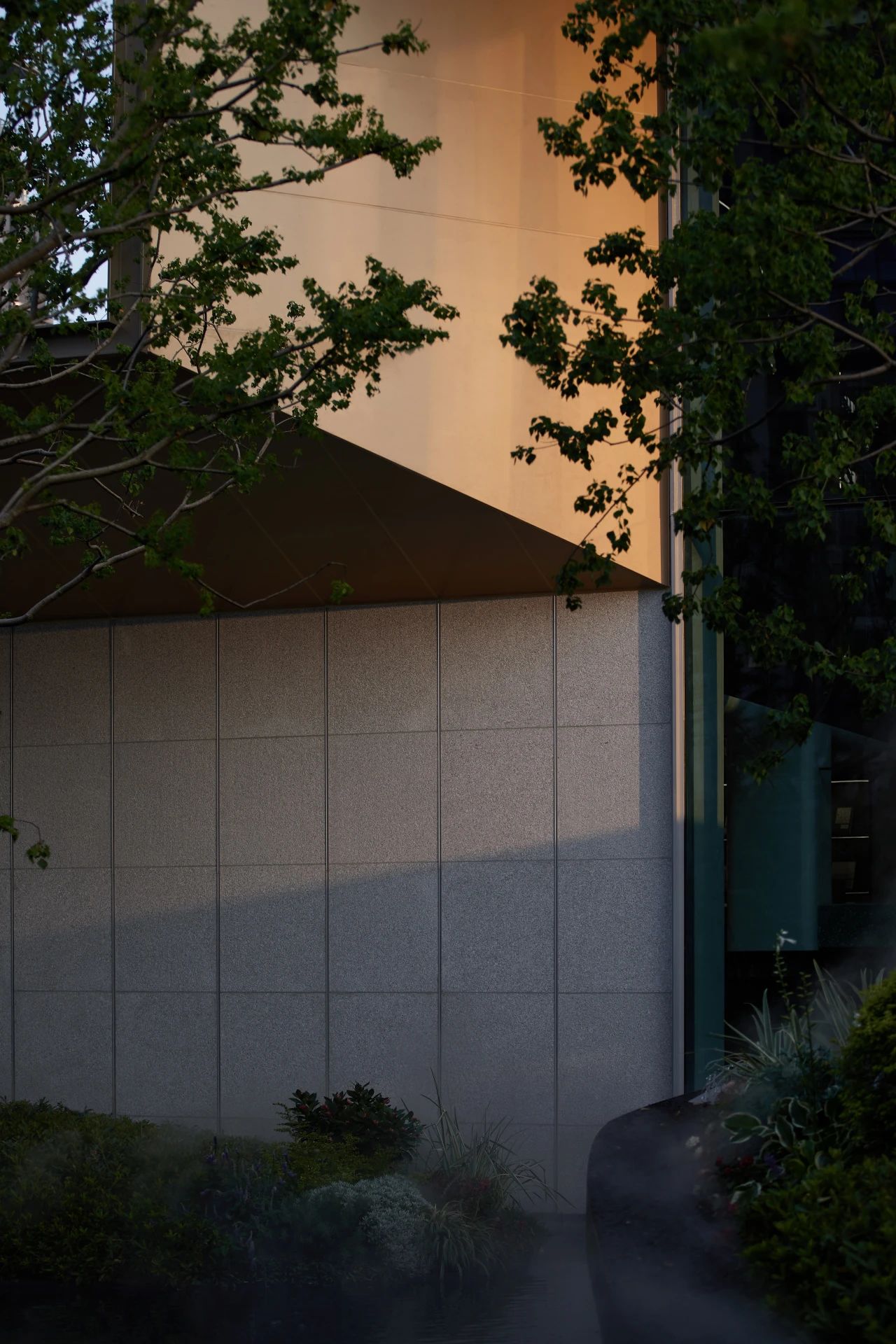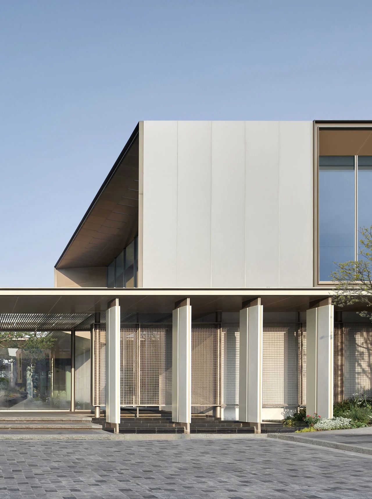 再來看蘇州世紀(jì)金源近湖源筑的立面,無界限的超白玻將室外景致無限引入室內(nèi),淺色系的白金石材搭配木紋鋁板營造輕盈且通透的建筑體量。