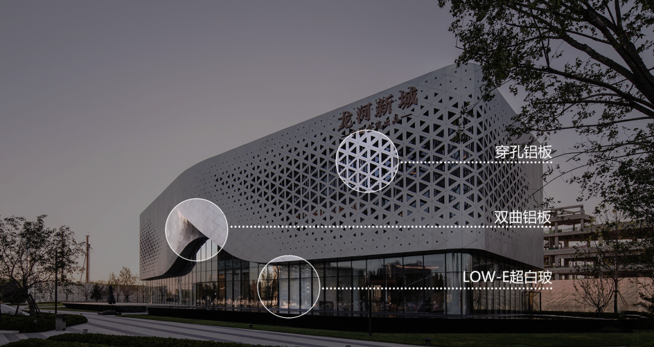 廊坊金茂龍河時代城市客廳外立面通過雙曲鋁板、穿孔板以及底層超白玻的材質(zhì)組合,既凸顯了建筑的雕塑感和現(xiàn)代感,又確保了視線的通透性和與景觀的互動性。