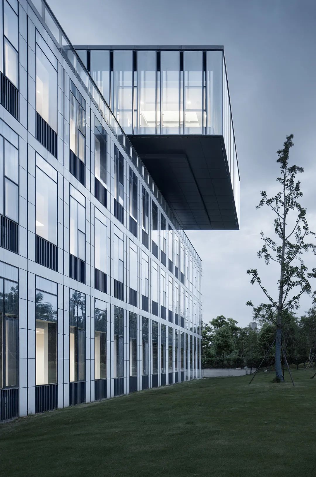 杭州錢江新城市政設(shè)施養(yǎng)護(hù)維修配套用房在材料的選用上,采用藍(lán)灰色玻璃及淺灰色石材干掛,搭配深色金屬板,打造清新明快的風(fēng)格。立面開窗采用模數(shù)化的處理方式,展現(xiàn)簡潔統(tǒng)一的效果。