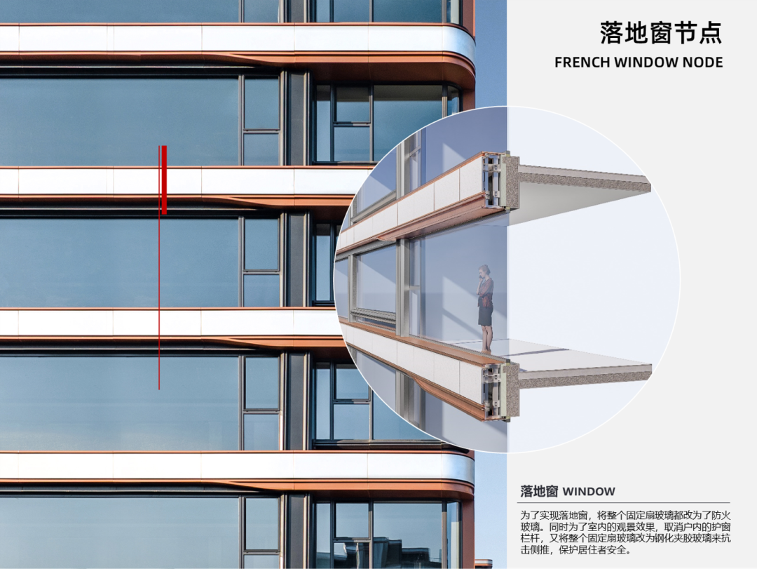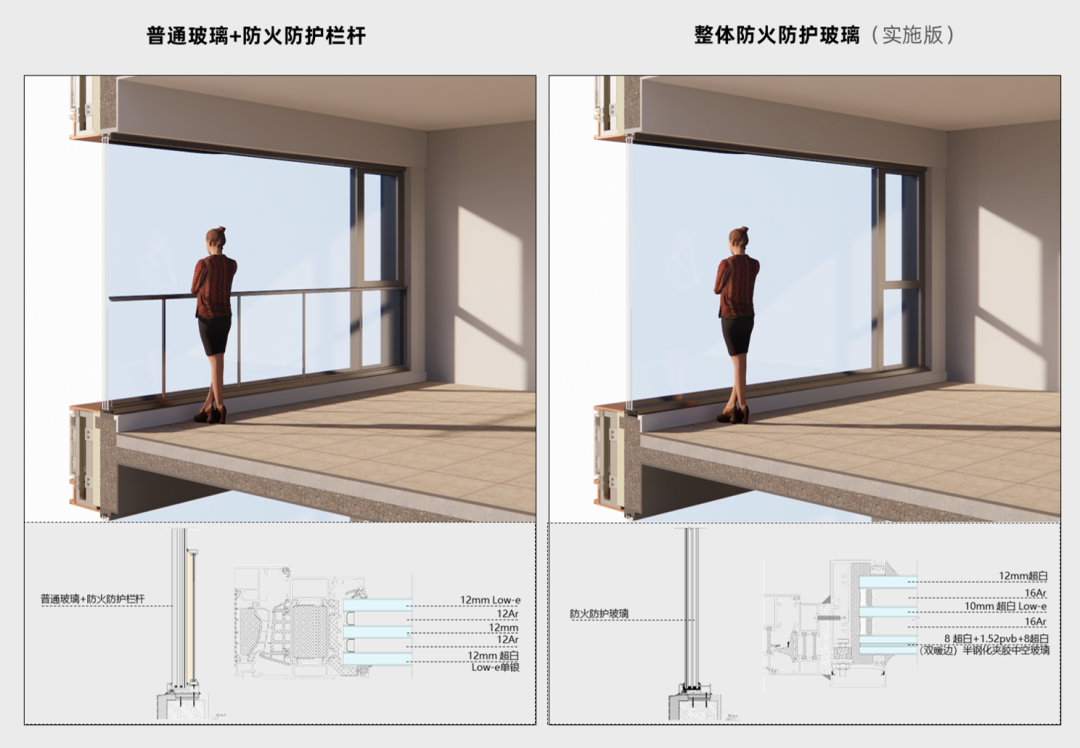 第二種方式,將整個(gè)固定扇玻璃都改為了防火玻璃以及鋼化夾膠處理,兼顧防火和防護(hù),從而取消室內(nèi)的防護(hù)欄板??此评速M(fèi),但對(duì)比第一種防護(hù)欄板的額外的金屬支撐桿件等綜合安裝成本,兩者成本相差無(wú)幾。通過(guò)對(duì)構(gòu)造措施的優(yōu)化調(diào)整,換來(lái)了室內(nèi)外更極致的觀賞體驗(yàn)。