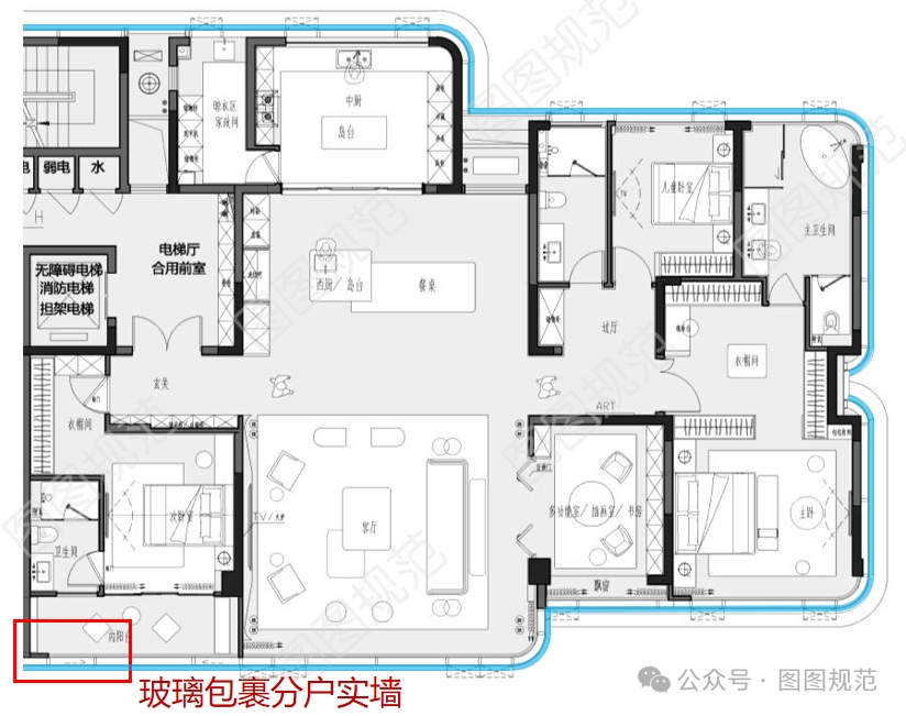 以下圖來(lái)看(具體做法不詳),透過(guò)下圖我們可以分析,如果為了達(dá)到完全的通透,也可以在老人房次衛(wèi)將飄窗固定扇使用耐火完整性和耐火隔熱性均達(dá)到1.0h的防火玻璃,來(lái)滿足水平方向防火分隔要求。