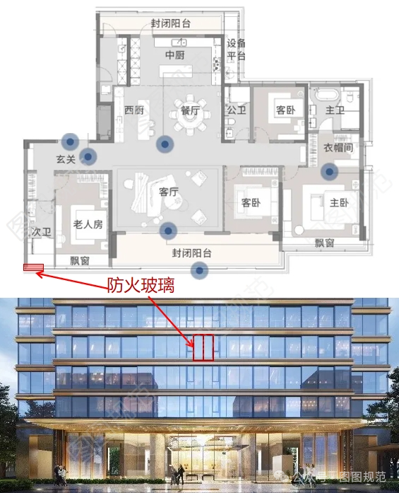 還有一種方式,水平方向防火分隔可以使用防火玻璃來(lái)實(shí)現(xiàn)。