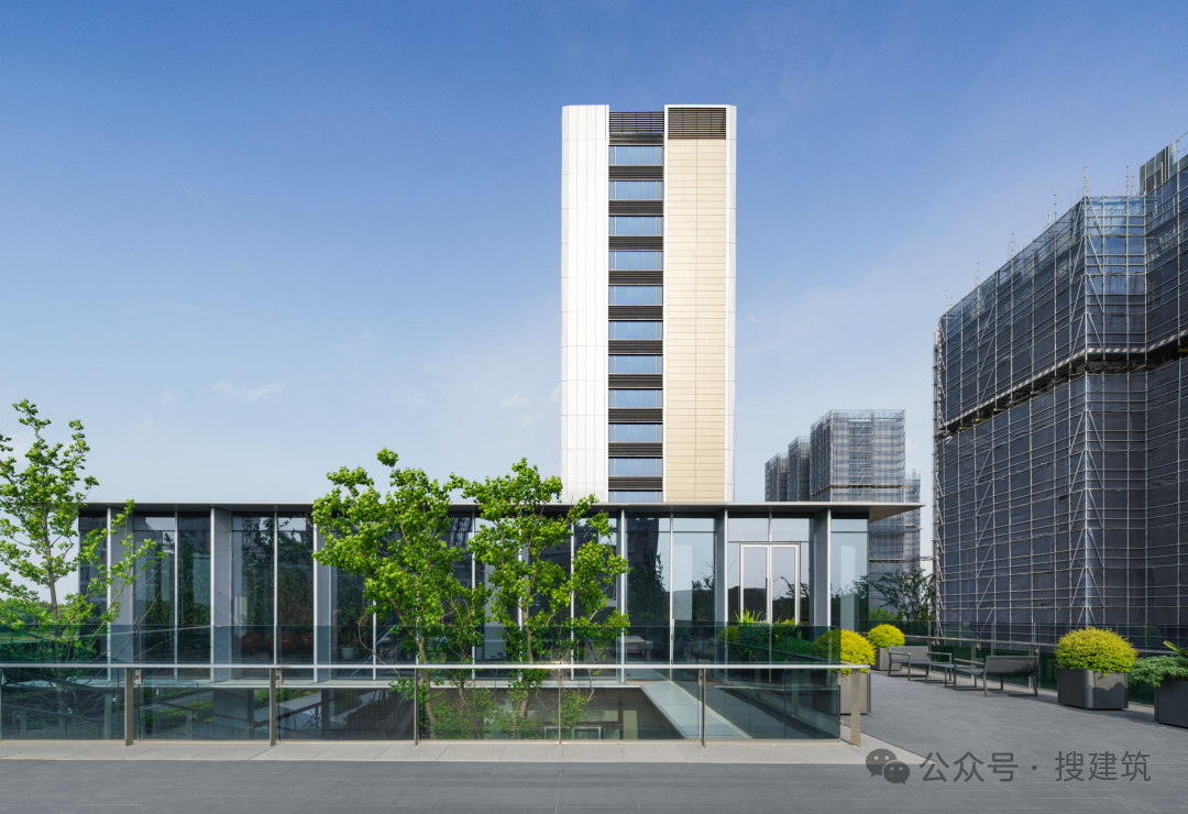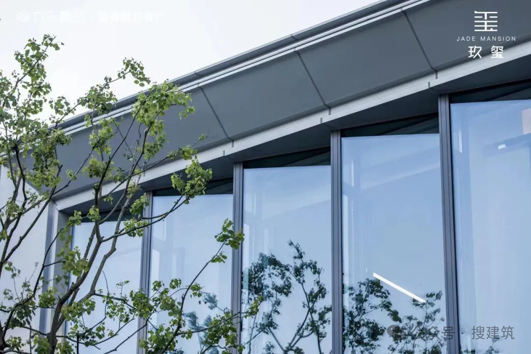 銀灰色鋁板勾勒出建筑形體,木紋色鋁板描畫線條層次,再加上傳統(tǒng)坡屋頂+小披檐元素,讓建筑外立面脫穎而出,不僅提升了整體的顏值和辨識(shí)度,更是使得整座建筑更加溫暖,消解了公建化立面的清冷嚴(yán)肅。再加上三玻兩腔Low-E玻璃,其中單塊玻璃的最大觀景尺度,就達(dá)到了235*150cm。打造出“少梁化”的空間營造邏輯,呈現(xiàn)約65%超高窗墻比,使得建筑整體更具通透大氣的現(xiàn)代審美。