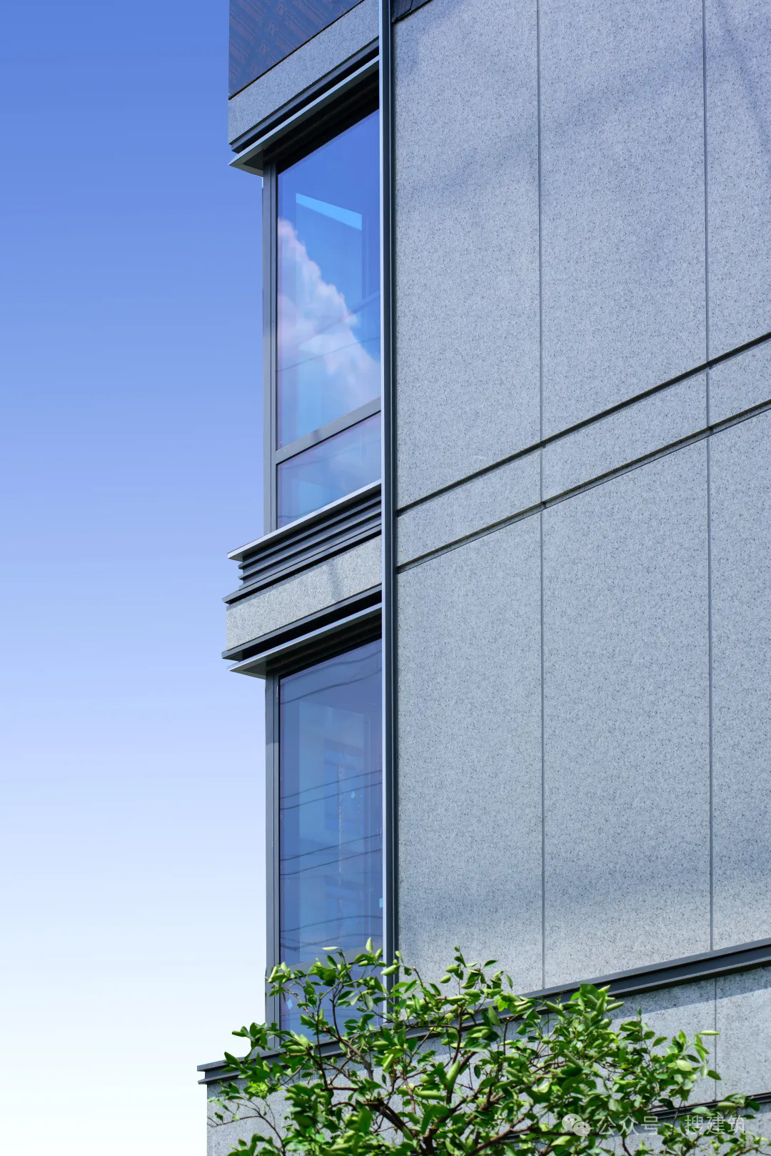 不僅南北立面,是造價(jià)昂貴的鋁板外,就連易于忽視的兩側(cè)山墻,同樣也是鋁板等高階型材干掛。