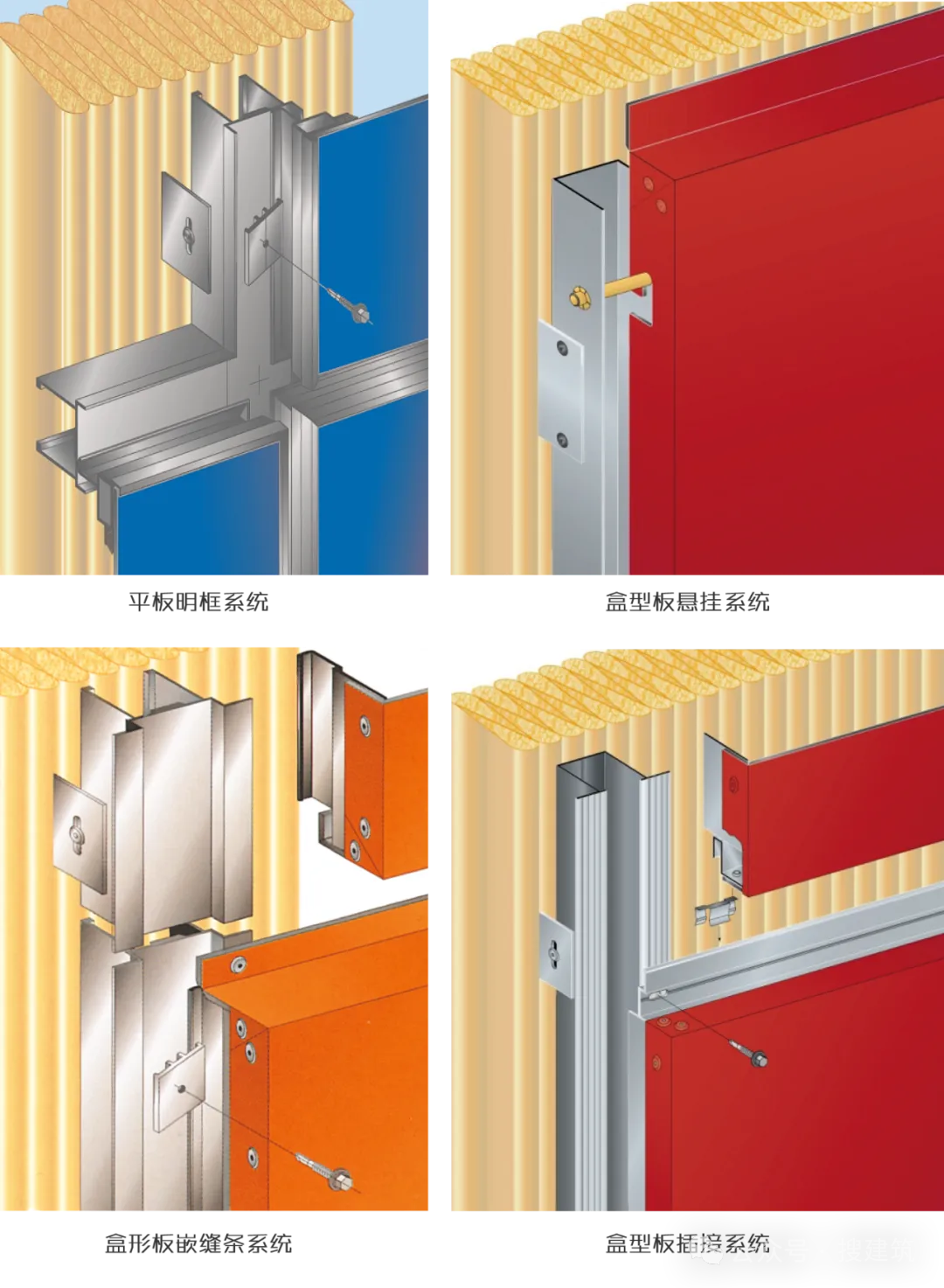常見的開放式幕墻安裝系統(tǒng)有平板明框系統(tǒng)、盒型板懸掛系統(tǒng)、盒形板嵌縫條系統(tǒng)、盒型板插接系統(tǒng)等。