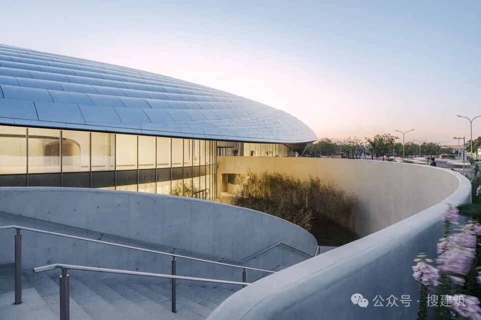 夜晚,隱匿于屋面百葉板縫間的燈光與屋面線條同步舒展,動(dòng)靜相宜、相映成趣,既呼應(yīng)著城市主干道川流不息的車流,也為城市增添了活力與動(dòng)力。