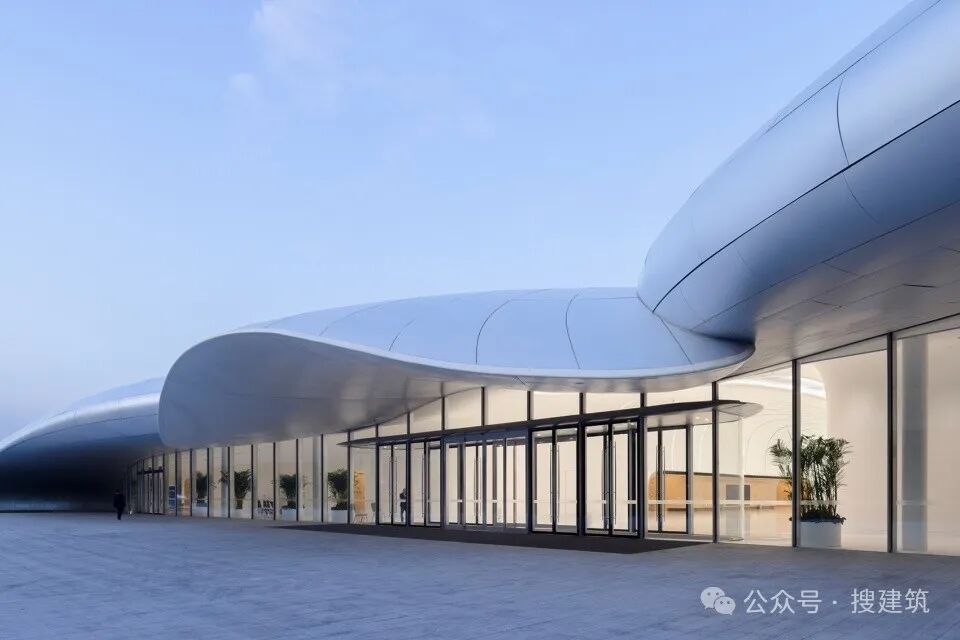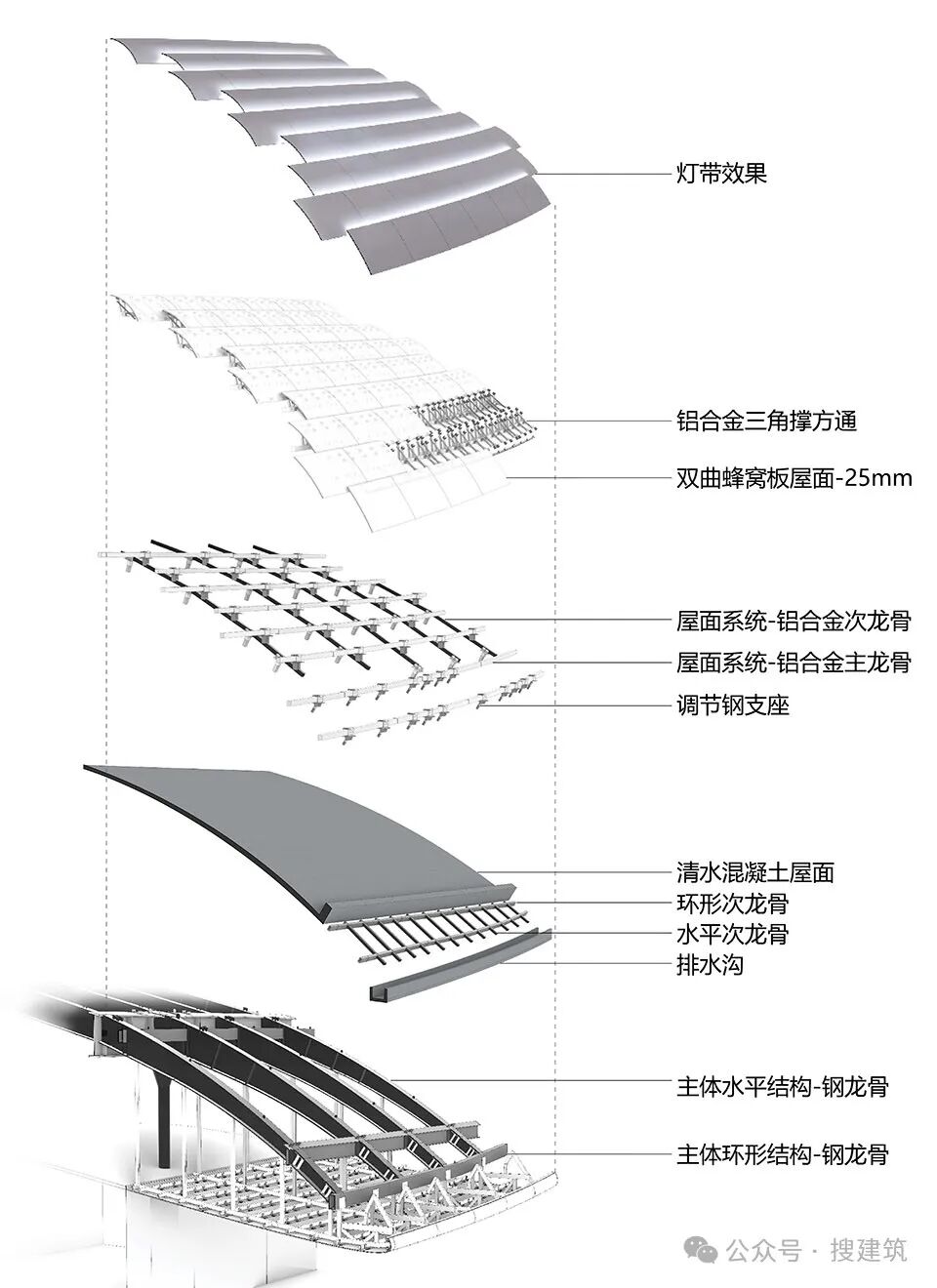 北京中關(guān)村國際創(chuàng)新中心屋頂由2769塊形狀、曲率各不相同的氟碳噴涂雙曲蜂窩鋁板,以“下搭上”的形式排布于屋頂?shù)漠愋武摻Y(jié)構(gòu)之上,形成疏密有致的銀白色百葉,也有利于隱藏構(gòu)造、收集雨水。