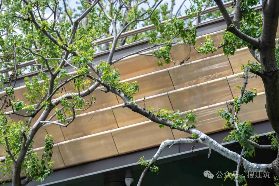 陶板的光影變化,比鋁板更豐富;陶板的質(zhì)感,比石材靈動。橫向鑲嵌在外立面的陶板,起到了重要作用,它讓整個建筑更溫潤,更靈動——它像愛馬仕的斜紋縫線一樣,起到的是點睛之筆的作用。