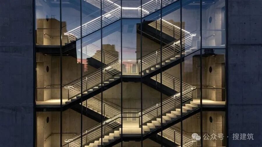 該建筑的混合結(jié)構(gòu)包括一個傳統(tǒng)的混凝土建筑(核心、柱和板)和一個兩層的模塊,創(chuàng)造了間隙層。一個雕塑般的、透明的剪刀樓梯解放了核心,鼓勵連接和互動。帶有懸浮夾層的雙高系統(tǒng)創(chuàng)造了中間層次,最大限度地提高了可用面積,并產(chǎn)生了靈活和空間變化的樓板。