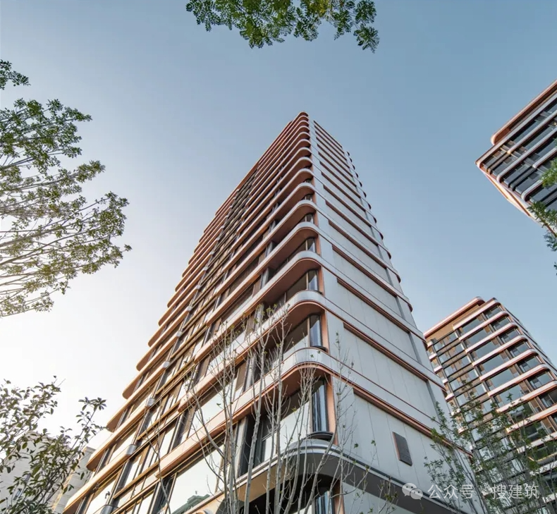 潤達豐控股 濱江·天樾建筑側(cè)面采用米黃色真石漆與深灰色涂料和深灰色穿孔鋁板結(jié)合,虛與實的對比將建筑映襯得干凈、純粹而又輕盈。